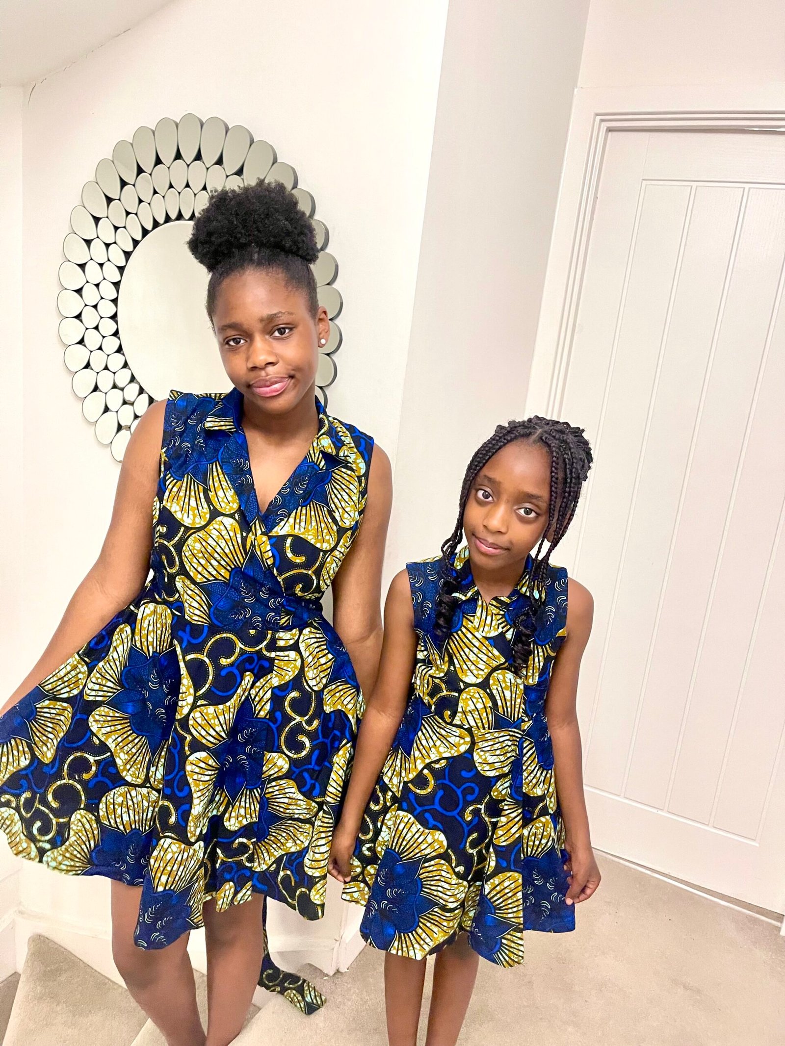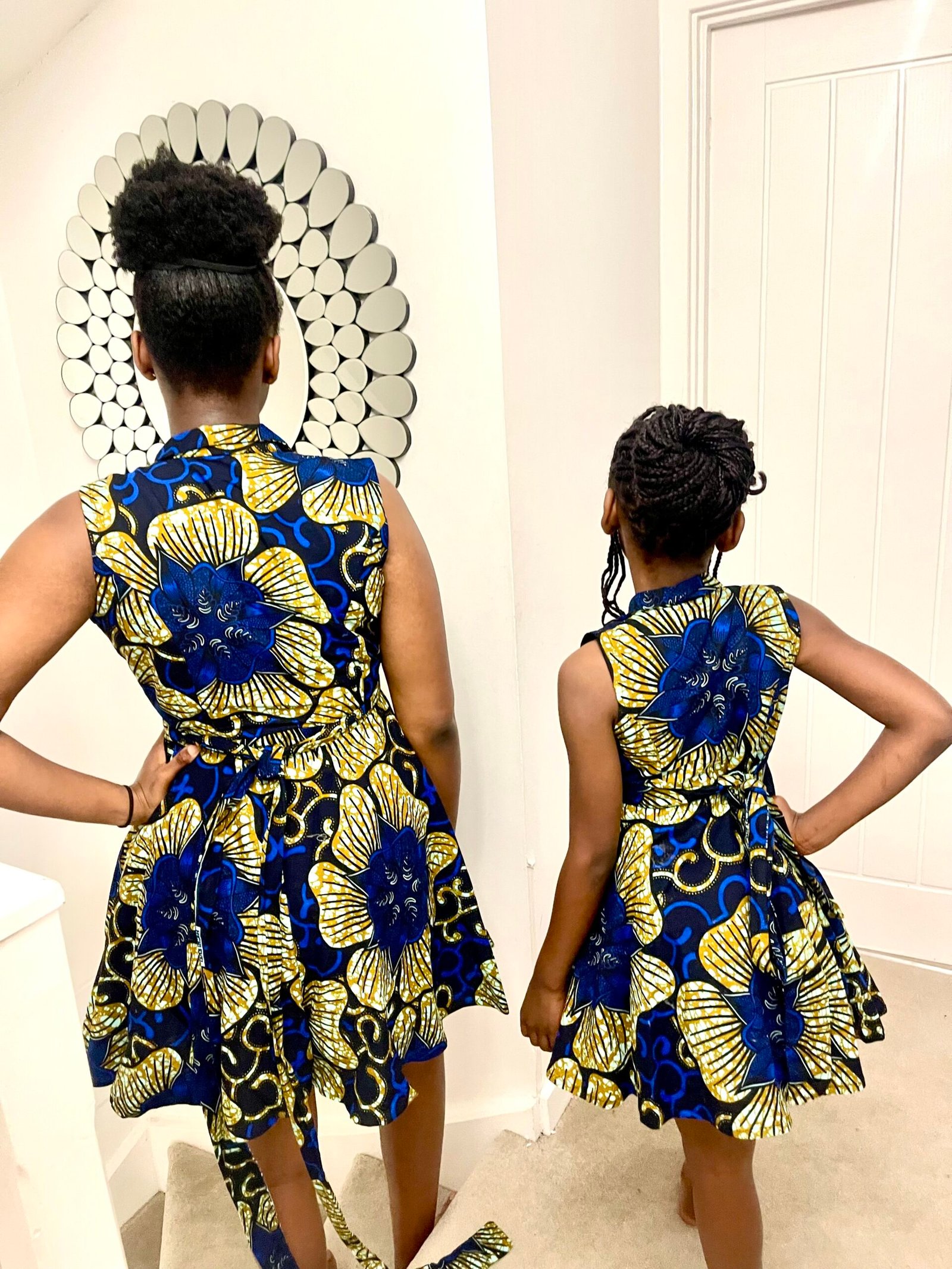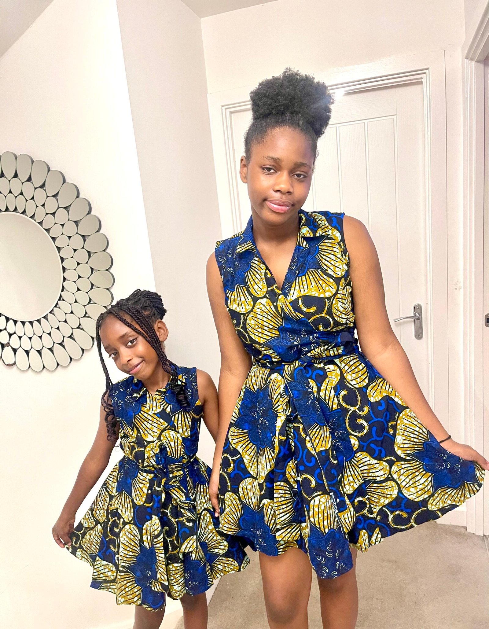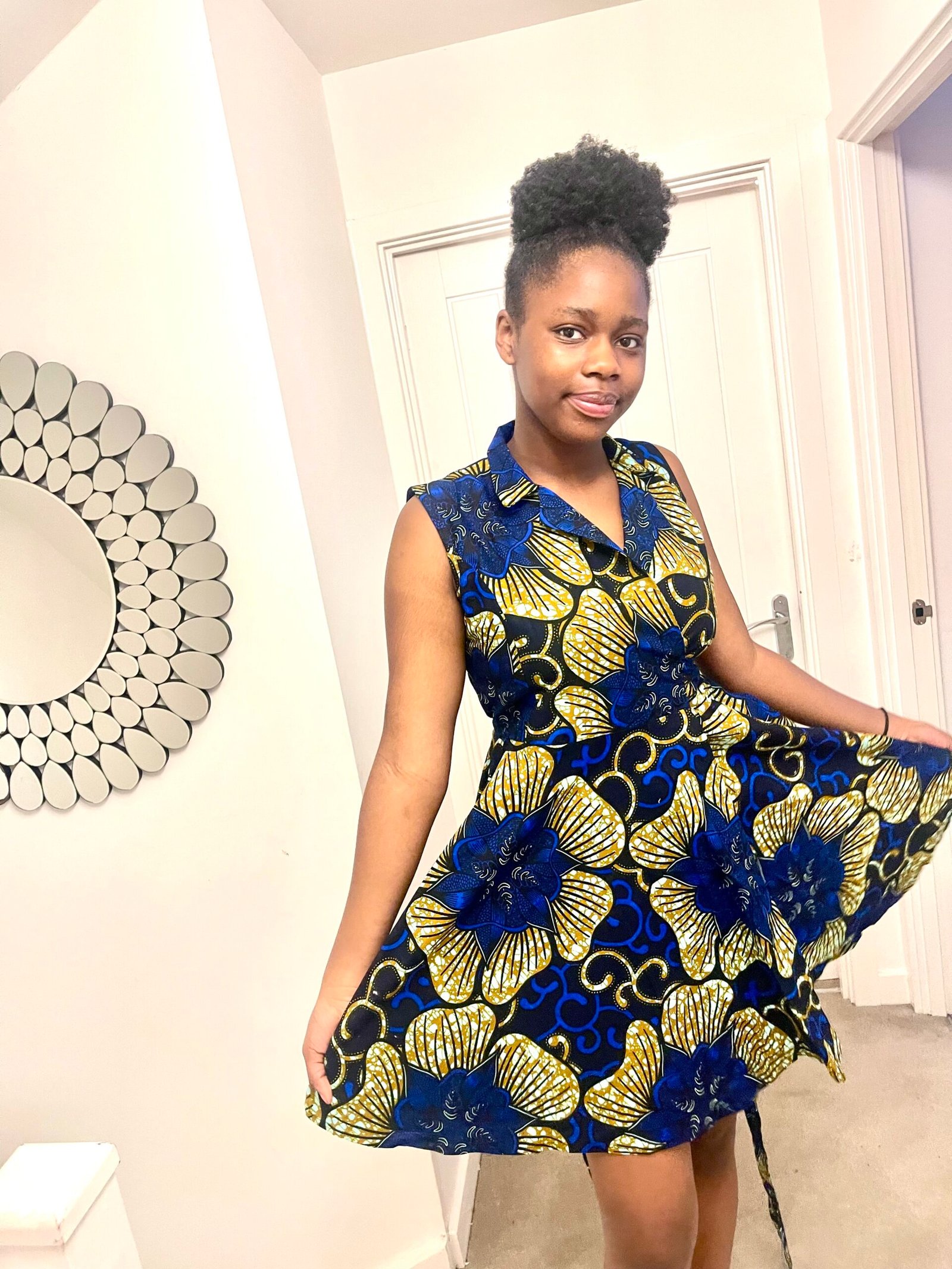 Designed to cinch at the waist and flow into a beautiful flared skirt, it enhances your silhouette while keeping you comfortable all day. The bold blue and gold floral print adds elegance and cultural flair, making it perfect for brunches, parties, cultural events, or special occasions.