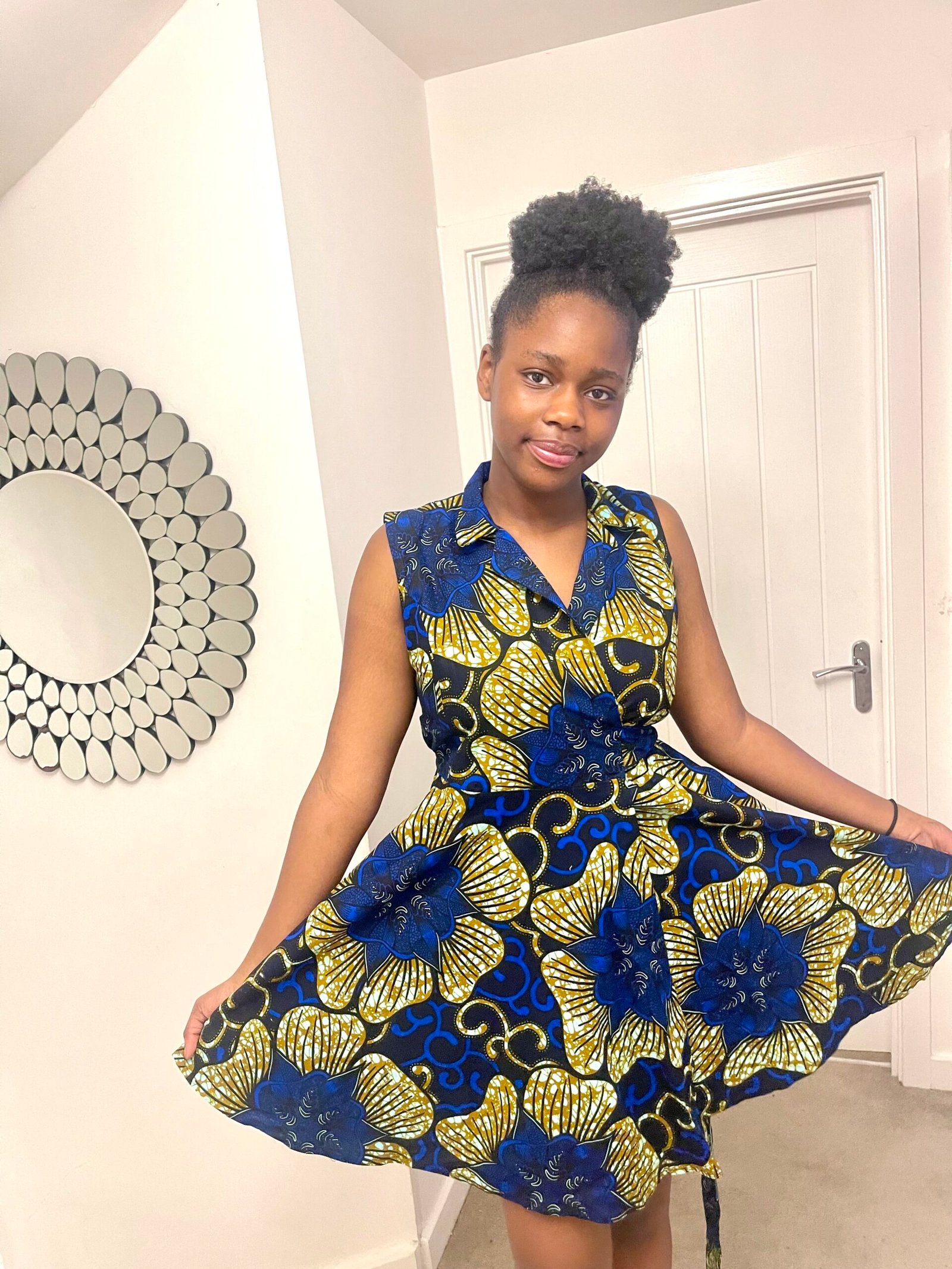 Turn heads in our stunning Blue Bloom Wrap Flare Dress, crafted from vibrant 100% cotton African print fabric. This flattering wrap-style dress features adjustable strings that allow you to fasten and style it exactly how you want for the perfect fit.