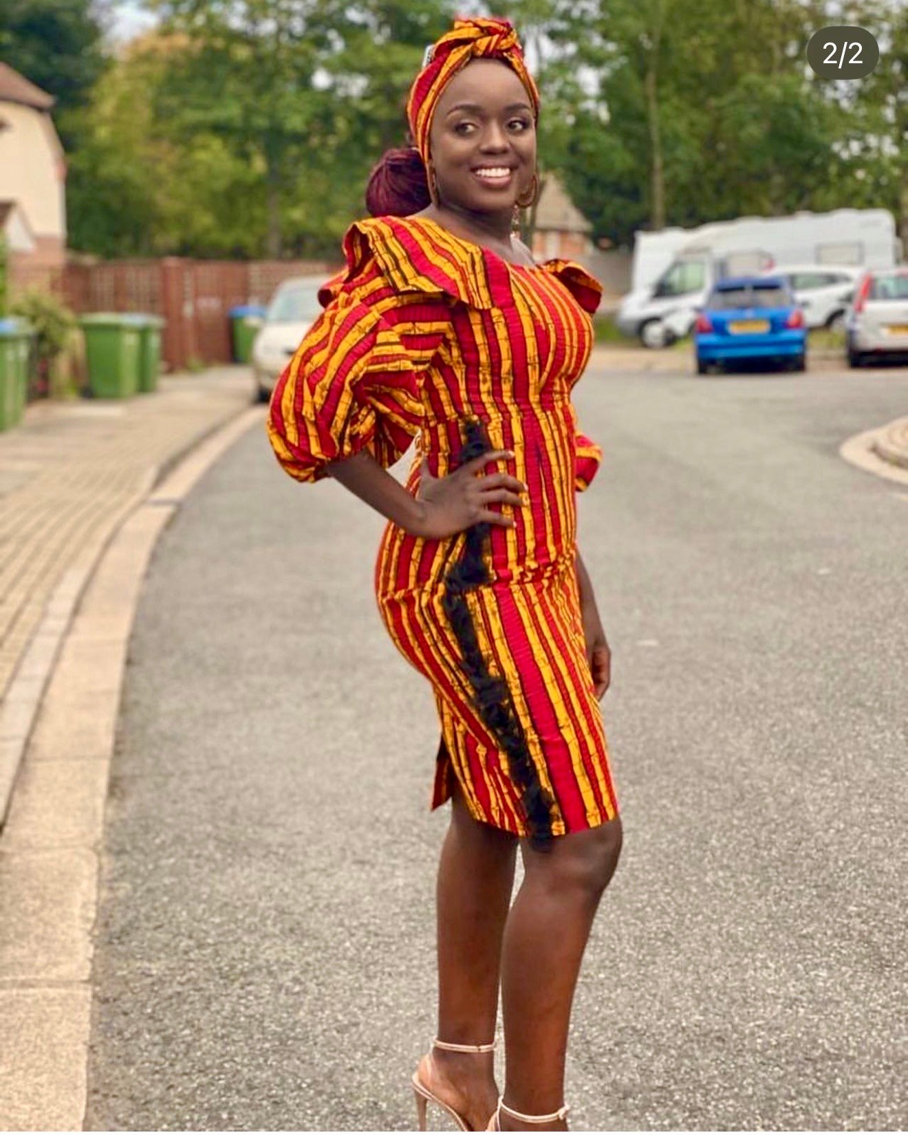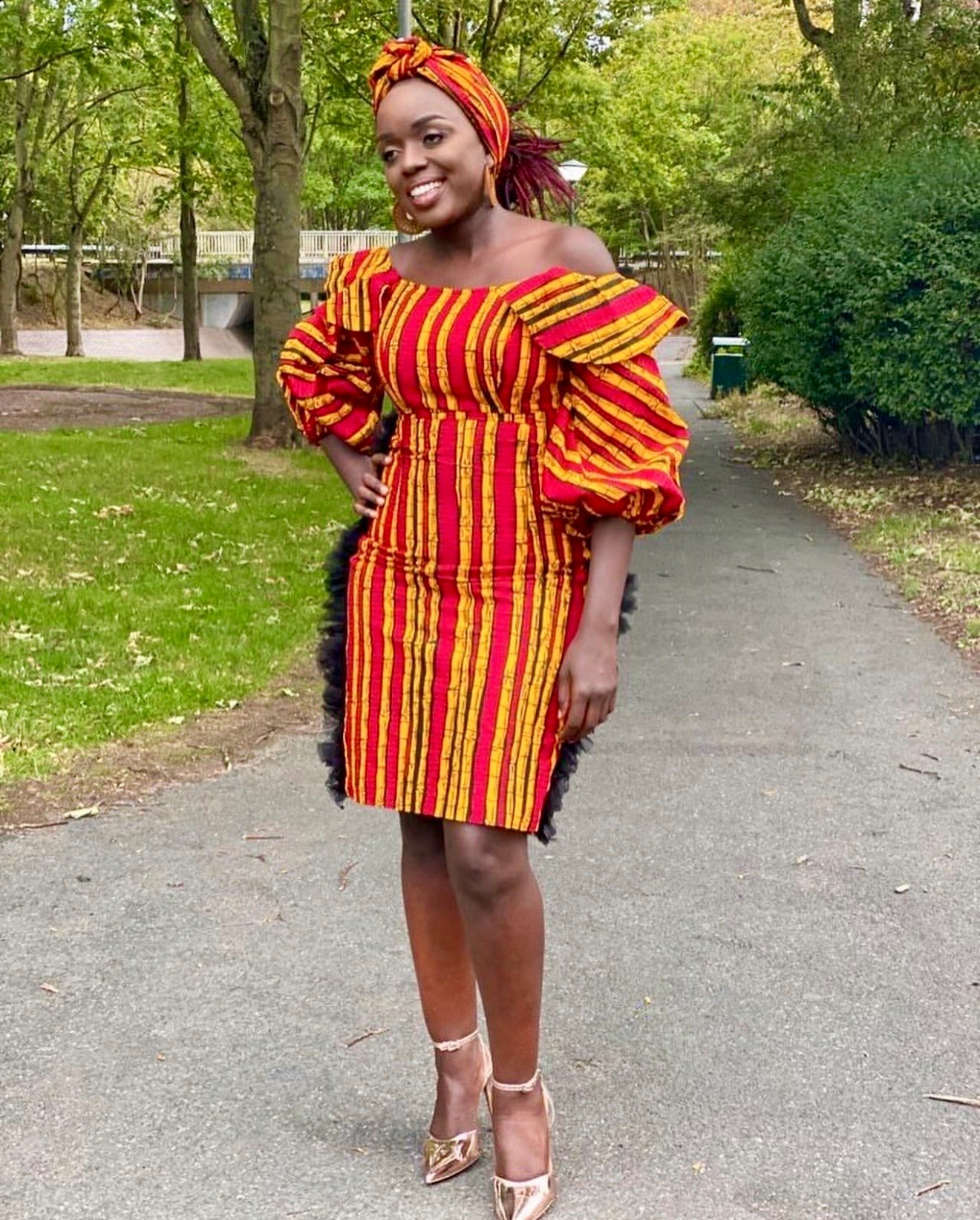 Make a bold statement in our Tanji Off-Shoulder Dress, designed in a vibrant red and yellow sugarcane-inspired African print. This stunning bodycon dress beautifully combines culture and contemporary style.